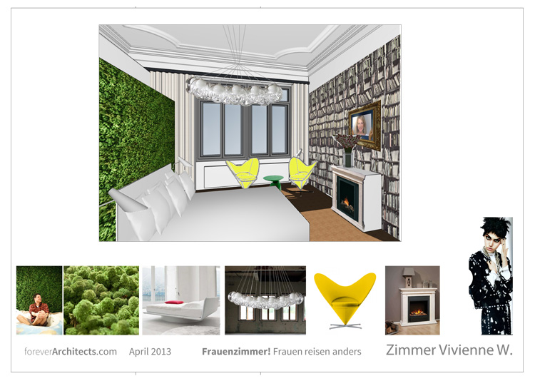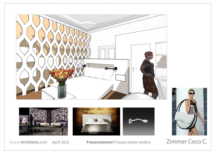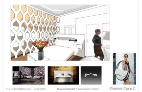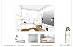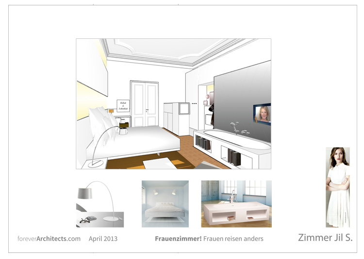 Mit seinen „wohnlichen“ Qualitäten der Objekte, wird das Zimmer zu einem Ort der Entspannung und Erholung in einer durch die ständige Erreichbarkeit geprägten Gesellschaft. Die Badewanne ist so positioniert, dass die Möglichkeit besteht, durch das große Fenster auf einen Baum und in den Himmel zu blicken, oder bei einem Lieblings-Video zu entspannen. Großzügige Ablagen bieten ausreichend Platz für die Kosmetika und Düfte.