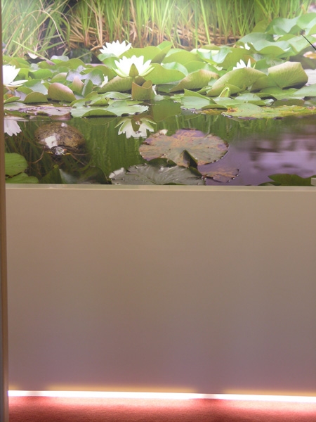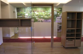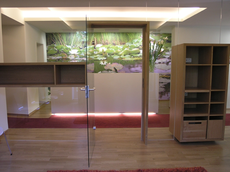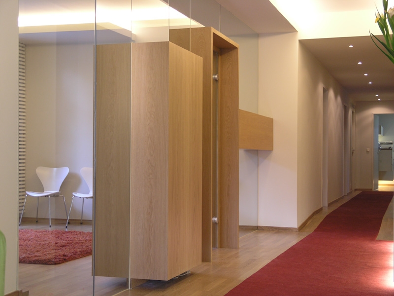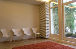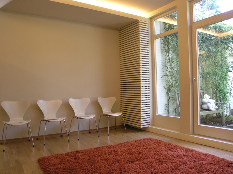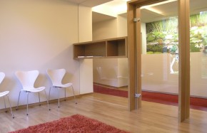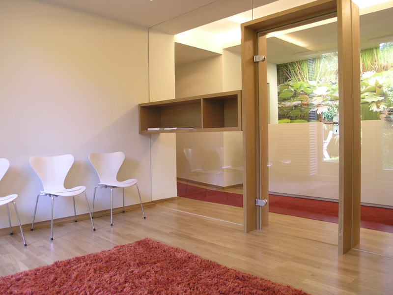 Mit 4 Behandlungsräumen und einem Wartebereich – als gläserner Kubus eingeschoben – mit Blick zum Empfang und zur anderen Seite zum Garten.